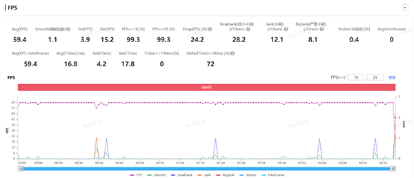 在使命召喚手游測(cè)試中,高清畫(huà)質(zhì)+極限幀率下,由于局外會(huì)掉幀,因此我們只記錄下對(duì)戰(zhàn)時(shí)的幀率曲線,在近2分半鐘的游戲中沒(méi)有大幅度的掉幀,平均幀率穩(wěn)定在了59.4FPS。