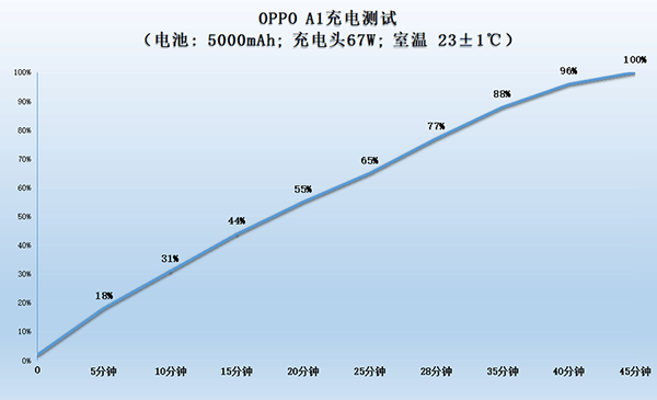在實際的續(xù)航測試中,OPPO A1在15分鐘內(nèi)補充了44%的電量,可以滿足用戶的短時間補電需求,完整充滿則耗時44分鐘,對于這一個5000mAh的大容量電池來說,并不算慢。