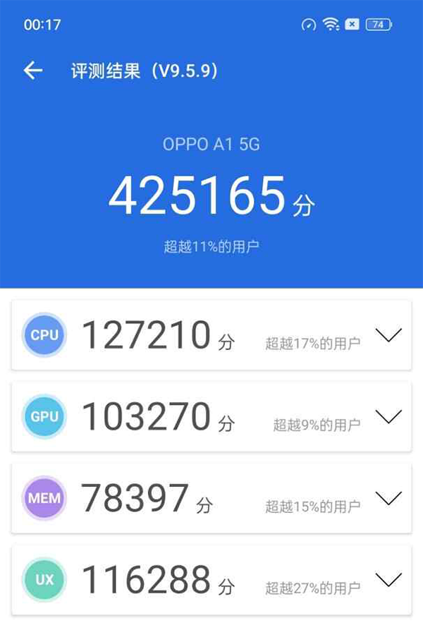 在這個硬件配置上,OPPO A1采用了驍龍695移動平臺,這一顆驍龍695使用了臺積電的6nm制程,由兩個2.2GHz A78核心和6個1.8GHz A55核心組成,其集成了Adreno 619 GPU。通過安兔兔跑分測試我們可以看到,OPPO A1的最終得分為42萬分左右,這一個表現(xiàn)可以滿足到用戶大部分的日常使用需求了。