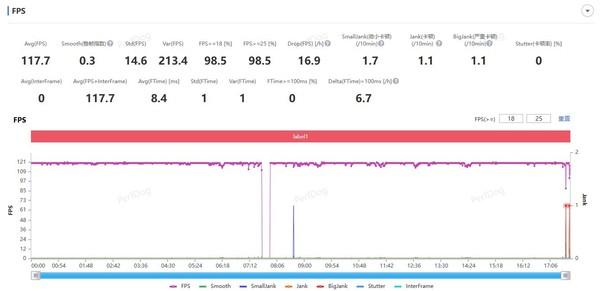 通過PerfDog的數(shù)據(jù)也可以看出,三星S23 Ultra在運(yùn)行《王者榮耀》時(shí),其幀率十分穩(wěn)定,基本一直保持在120幀這一條直線上(圖中7-8分鐘時(shí)出現(xiàn)無幀率的情況是由于筆者在游戲中“死亡”后將游戲切換到了后臺),即使是在激烈的團(tuán)戰(zhàn)、推水晶時(shí),幀率也能夠保持穩(wěn)定。
