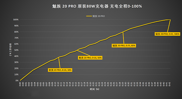 繪制出折線圖,可以清楚看出使用原裝80W充電器為魅族20 Pro 10分鐘充至38%;充至16分鐘充至50%;29分鐘充至80%;完全充滿耗時約42分鐘。