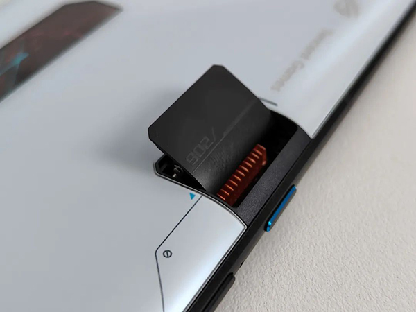這次的ROG 7 Pro作為游戲機(jī)整體的風(fēng)格設(shè)計還是頗具有電競元素的,可以說是延續(xù)了上代的設(shè)計風(fēng)格,邊邊角角都處理得很圓潤,對于用過這個品牌手機(jī)的用戶來說并不是陌生了,尤其是在雙手橫向握持的時候,不會對虎口、手指等部分造成壓力,手感極佳,在一些個性的設(shè)計上同樣敢是延續(xù)了上一代的特點,比如這個酷冷風(fēng)動閥,在這一代的ROG 7 Pro手機(jī)上同樣敢是被繼承下來了。