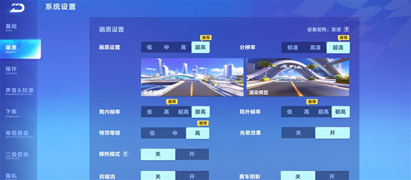 在《QQ飛車》中,開啟超高畫質(zhì),我們將分辨率選擇超清,局內(nèi)、局外的幀率都選擇極高。