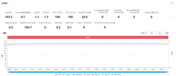 《QQ飛車》在游戲內(nèi)的平均幀率為165.5 FPS,屬于滿幀的水平,整體穩(wěn)如一條直線。