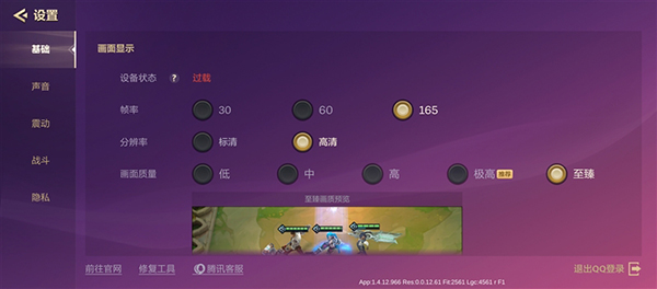 在《金鏟鏟之戰(zhàn)》的畫質(zhì)設(shè)置中,幀率選擇最高165,分辨率選擇高清,畫面質(zhì)量選擇至臻。