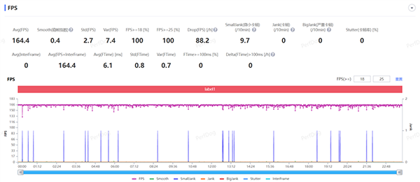 在《金鏟鏟之戰(zhàn)》進行了23分鐘的多人對戰(zhàn)后,整體幀率也比較平穩(wěn),平均幀數(shù)164.4 FPS,機身溫度在42攝氏度。