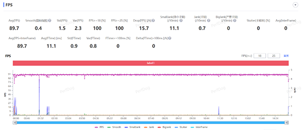 和平精英手游,在開啟流暢畫質(zhì)下,可以最高90幀運(yùn)行,經(jīng)過一句團(tuán)戰(zhàn)近15分鐘的測(cè)試,平均幀率維持在了89.7FPS,平均波動(dòng)1.5FPS,全局可以穩(wěn)定在一條直線上,游戲過程非常穩(wěn)定。