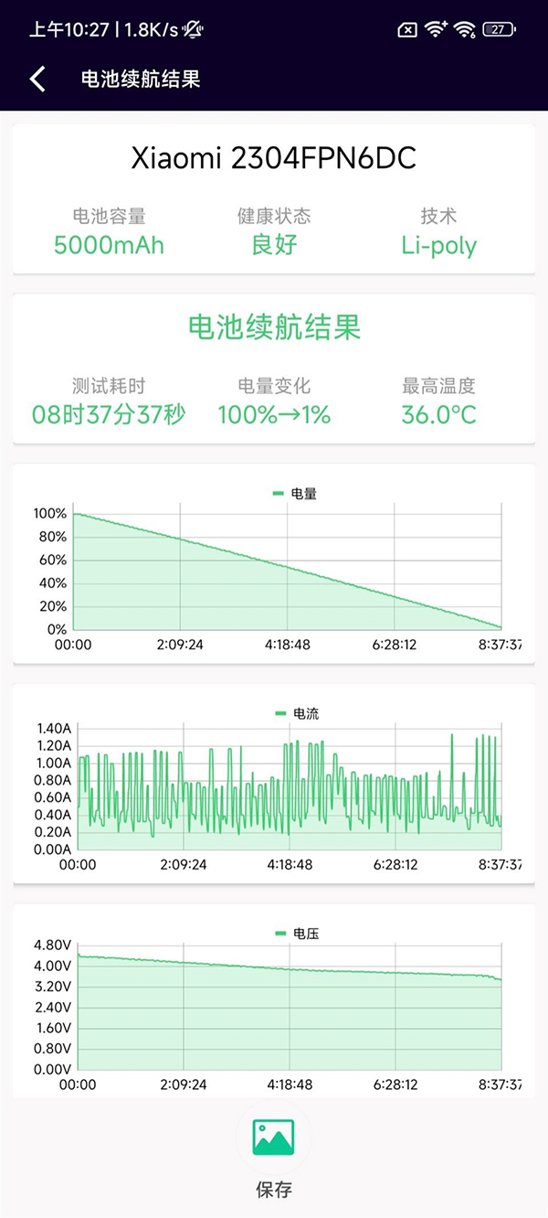 我們將手機(jī)的亮度調(diào)至50%,使用2K分辨率(3200×1440)、自適應(yīng)刷新率進(jìn)行測(cè)試,經(jīng)過(guò)電池狗狗的測(cè)試,小米13 Ultra的電量從100%消耗至1%用時(shí)8小時(shí)37分鐘,按照一般用戶的使用情況,完全可以提供一整天的間歇性使用時(shí)長(zhǎng),如果想要更高的續(xù)航,可以適當(dāng)降低屏幕的刷新率與分辨率。