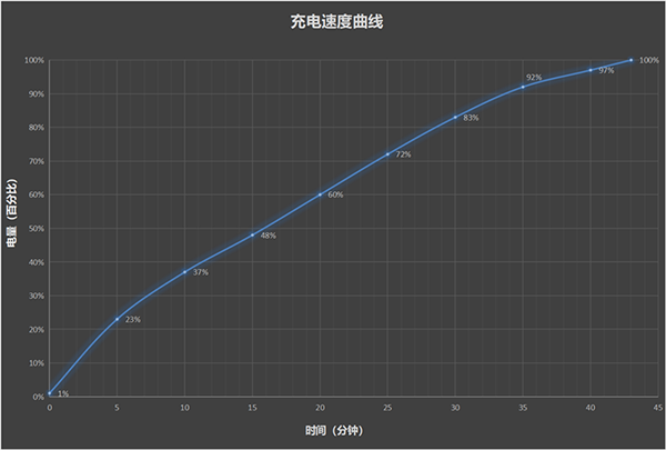 經(jīng)過(guò)測(cè)試,從1%開始充電,5分鐘充電至23%,10分鐘充電至37%,20分鐘充電至60%,半小時(shí)充電83,%,完全充滿用時(shí)43分鐘。