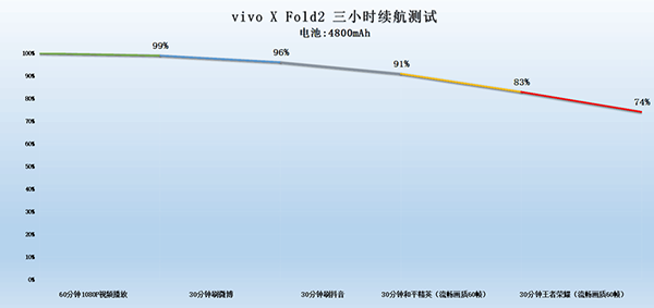 在娛樂場景的連續(xù)三小時(shí)測試后,vivo X Fold2剩余的電量為74%,從這一表現(xiàn)進(jìn)行推測,其滿足大部分用戶的一天日常所需是不在話下的。