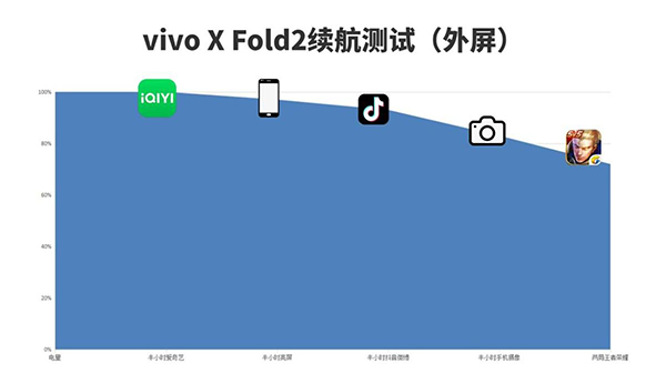 從測試來看,vivo X Fold2內外屏的續(xù)航水平都相當不錯,內屏因為更大的屏幕尺寸在白色界面亮屏時會有比較明顯的續(xù)航差距,不過內外屏整體續(xù)航時間差距不大,即便是長時間使用內屏進行商務辦公,一天的續(xù)航也是夠用的。
