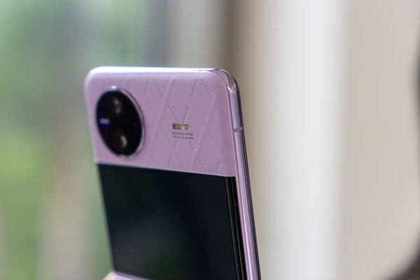 配色方面,vivo X Flip提供了菱紫、綢金、鉆黑三種配色,筆者拿到的是菱紫配色,作為主打款,菱紫版本采用了立體皮革設計,相對于傳統素皮,小荔枝紋素皮加立體皮革設計讓奢侈品手提包菱格紋理的經典元素首次融入手機設計中,同時將質感和手感大幅提升,酥皮本身采用耐磨抗臟污材質,機身整體類香芋紫的色彩搭配不僅保留了浪漫的色彩感覺,并且視覺上更為溫和。