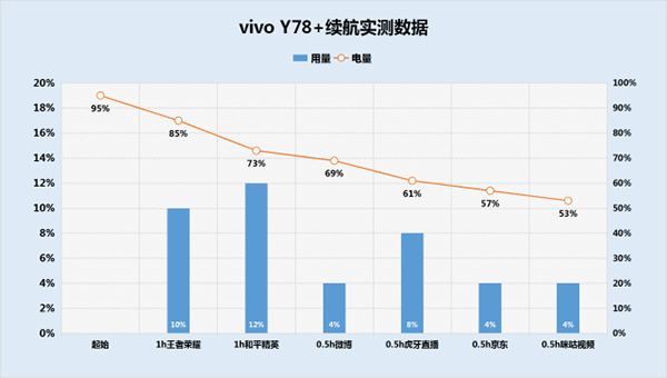 在我們的續(xù)航實(shí)測(cè)中,vivo Y78+通過四小時(shí)中度續(xù)航測(cè)試,僅花費(fèi)了42%的電量,坐實(shí)了“續(xù)航小霸王”的稱號(hào),基本可以滿足大部分用戶一整天都使用了。