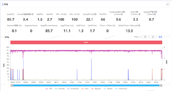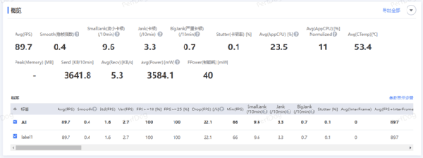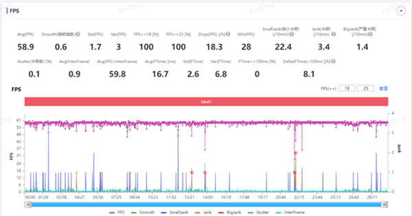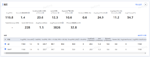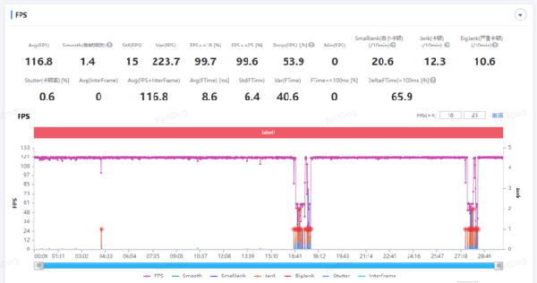 首先是《王者榮耀》,可以看到游戲幀率還是比較穩(wěn)定的,忽略平均幀率,兩次波動(dòng)是因?yàn)闇y(cè)試過(guò)程中一局游戲結(jié)束開啟下一局,導(dǎo)致了整體平均幀率的降低。游戲過(guò)程中畫面基本可以維持在滿幀運(yùn)行。