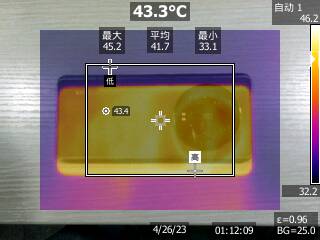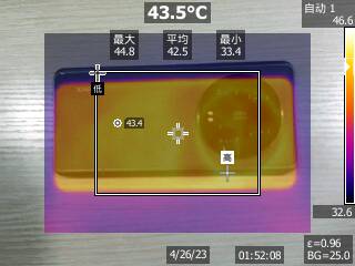 《王者榮耀》即便是120幀,整體的負(fù)載也不是很高,核心平均溫度54.7℃。從外部的測(cè)溫來(lái)看,機(jī)身最高溫度45.2℃,因?yàn)殓R頭模組的遮擋,最高溫度位置不在背部,不出意外地處在了靠近芯片一側(cè)的金屬邊框上。不過(guò)好在雙手握持時(shí)可以避開最高溫度點(diǎn)。