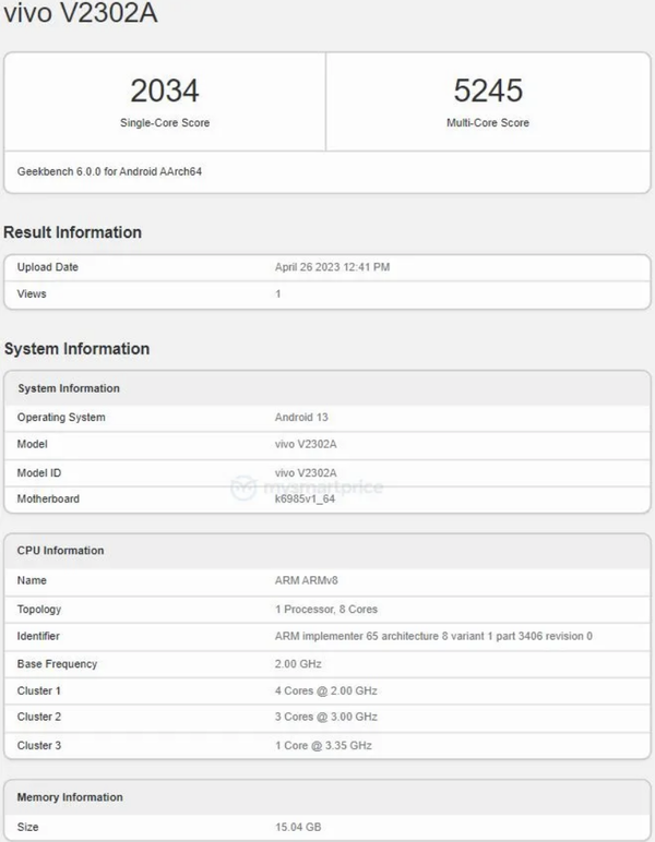 Geekbench的單核和多核測(cè)試結(jié)果顯示,該機(jī)的單核跑分成績(jī)?yōu)?034,多核跑分成績(jī)?yōu)?245。
