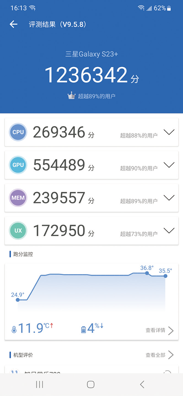 在《安兔兔評(píng)測(cè)v9.5.8》中,三星Galaxy S23+可以得到1236342分,這個(gè)分?jǐn)?shù)并沒(méi)有與其他第二代驍龍8移動(dòng)平臺(tái)機(jī)型拉開(kāi)差距,原因在于三星依舊保持著較為保守的性能調(diào)度策略,其UX單項(xiàng)成績(jī)低于其他機(jī)型,所以導(dǎo)致總分偏低。