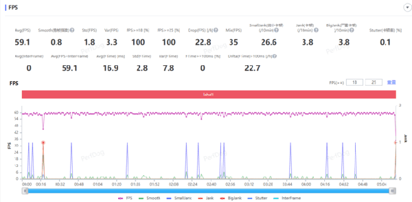 回合制戰(zhàn)斗場景我們選擇了“末日獸”場景,經(jīng)過實測榮耀Magic5至臻版在5分鐘戰(zhàn)斗流程中可以穩(wěn)定保持60幀的幀數(shù),實測平均幀數(shù)59.1幀,幀率曲線有輕微波動。