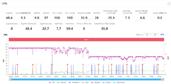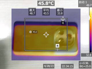 跑圖場景,我們選擇了空間站主控艙段場景,經(jīng)過實測榮耀Magic5至臻版在15分鐘跑圖流程中,前半段可以保持在60幀的水平,后半段會下降至40幀的水平,實測平均幀數(shù)48.4幀,幀率曲線有波動。在15分鐘跑圖測試之后,我們測試了機身溫度,實測機身后背平均溫度為45.8攝氏度,表現(xiàn)較好。