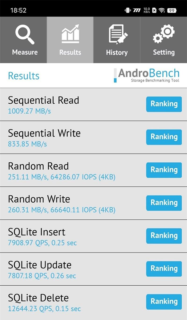 在Androbench測(cè)試中,順序讀取速度達(dá)到1009.27MB/s,順序?qū)懭胨俣冗_(dá)到833.85MB/s,隨機(jī)讀取速度251.11MB/s,隨機(jī)寫(xiě)入速度260.31MB/s,符合UFS2.2的水平。