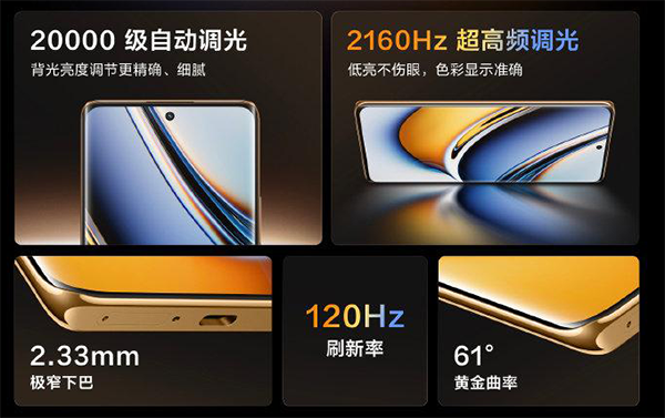 屏幕方面延續(xù)了前代的曲面屏設(shè)計(jì),擁有120Hz刷新率、2160Hz高頻PWM調(diào)光和2.33毫米的機(jī)身下巴,還新增了20000級(jí)自動(dòng)調(diào)光,兼顧高顏值、優(yōu)秀的顯示效果和極致的護(hù)眼體驗(yàn)。