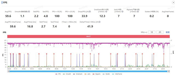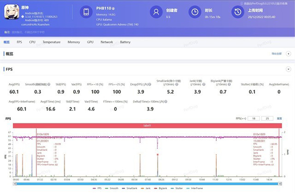 一加11游玩原神30分鐘的平均幀率為60.1,可以明顯的看出幀率更加穩(wěn)定一些。