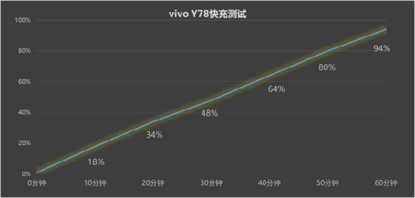 實(shí)測(cè)26分鐘的時(shí)間就可以充滿50%電量,完全充滿在一個(gè)75分鐘左右。此外,vivo Y78的電池的壽命更長(zhǎng),官方表示在1600次完整充放循環(huán)下電池容量仍大于80%。