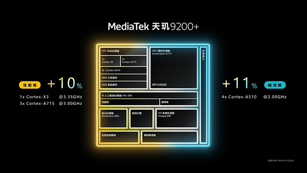 CPU頻率從天璣9200的3.05+2.85+1.8,提升到3.35+3+2(大核頻率提升10%,小核頻率提升11%)。