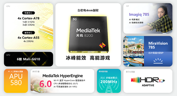 天璣8200在延續(xù)高性能、高能效優(yōu)勢的基礎上,進一步升級了影像、游戲等細分場景的用戶體驗。天璣8200采用先進的臺積電4nm制程,八核CPU架構(gòu)包含4個Cortex-A78大核,主頻高達3.1GHz,搭載Mali-G610六核GPU,助力終端充分釋放高性能、高能效優(yōu)勢。影像層面,天璣8200搭載強勁的Imagiq 785 ISP影像處理器和聯(lián)發(fā)科第五代AI處理器APU580,為高端手機提供出色的影像處理能力。
