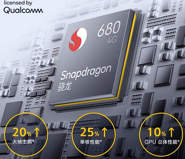 在這個硬件配置上,華為暢享60 Pro使用高通的驍龍680芯片,這款芯片本身就是4G芯片,因此暢享60 Pro還是不支持5G網(wǎng)絡。驍龍680基于6nm工藝,CPU包括4個2.4GHz主頻的A73大核心+4個1.8GHz主頻的A53小核心組成,Adreno 619 GPU,安兔兔跑分30萬左右,支持藍牙5.1和Wi-Fi 5。