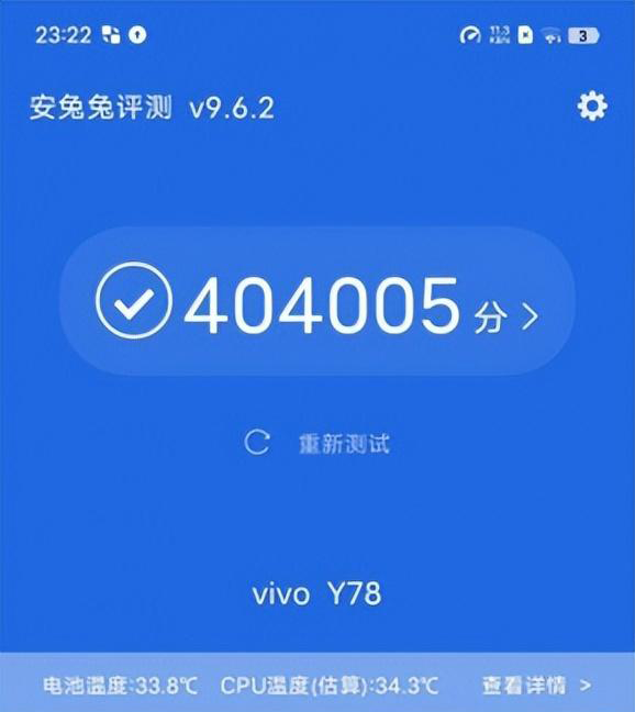 在看手機(jī)性能怎么樣的時(shí)候,有的人還是直觀的通過(guò)跑分來(lái)判斷了,通過(guò)跑分比乏味的硬件數(shù)據(jù)參數(shù)更直觀一些,很多人也是比較喜歡看性能跑分的,像這次的vivo Y78作為中低端的手機(jī),很多人還是想看看跑分是多少,在這里就把具體的安兔兔跑分來(lái)給大家說(shuō)一下了,答案是404005分,在同價(jià)位機(jī)型中屬于不錯(cuò)的水平,雖不能與頂級(jí)旗艦相比,但滿足日常各種場(chǎng)景的使用基本沒(méi)有問(wèn)題。