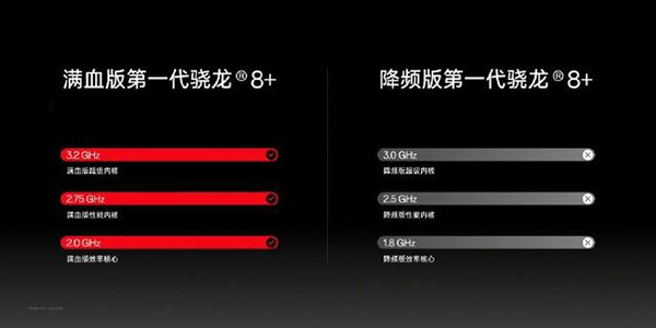 3.0GHz的降頻版驍龍8+也臺(tái)積電4nm工藝,CPU頻率和三星4nm的驍龍8 Gen 1完全一致,都是3.0GHz X2 + 3x2.5GHz A710 + 4x1.8GHz A510。而滿血3.2GHz的驍龍8+,是3.2GHz + 3x 2.75GHz + 4x2GHz。不過(guò)兩者的GPU都是900MHz的Adreno 730。