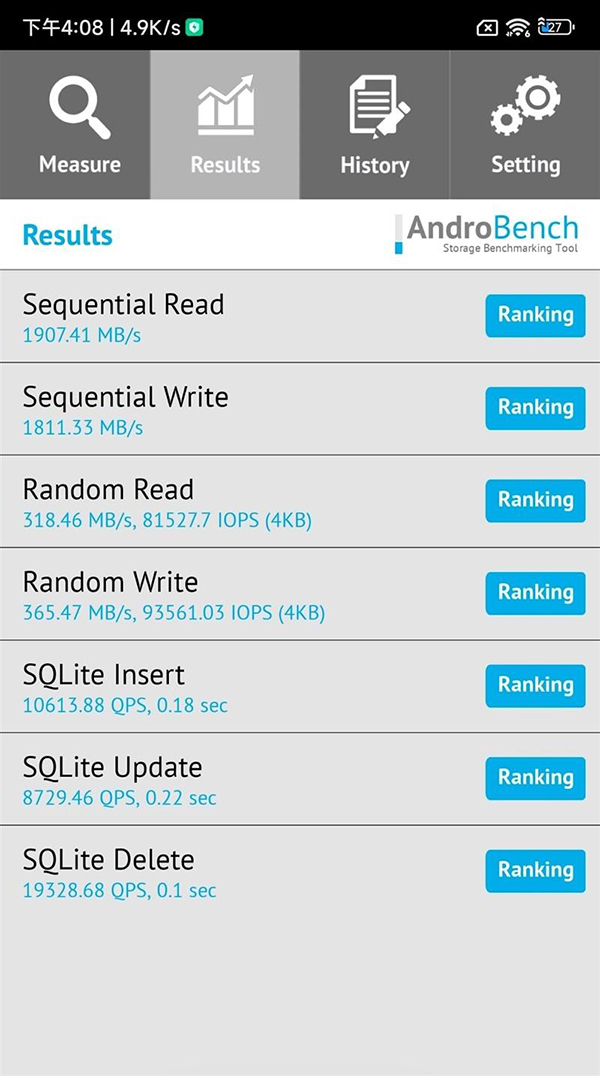 最后是Androbench存儲測試,順序讀取速度達到1907.41MB/s,順序寫入速度達1811.33MB/s,隨機讀取速度達318.46MB/s,隨機寫入速度達到365.47MB/s,符合UFS 3.1的水準。