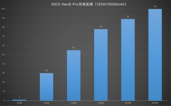 在這里進(jìn)行了充電實(shí)測,從1%電量開始熄屏充電,前5分鐘充電至30%,10分鐘充電至55%,15分鐘充電至73%,20分鐘充電至89%,25分鐘充電至100%。在充電過程中,前一分鐘iQOO Neo8 Pro能夠達(dá)到接近110W驚人的峰值功率,電量充至50%以上,此時(shí)仍保持著近50W的功率。
