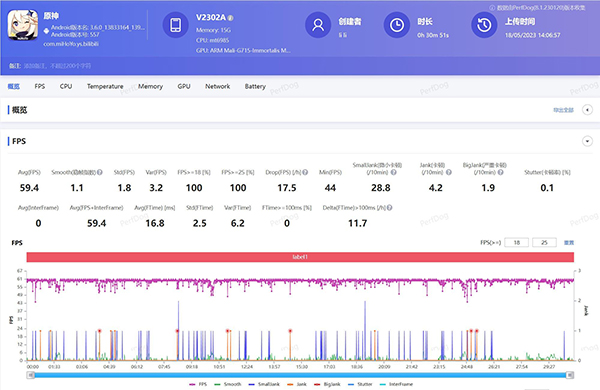在游戲測(cè)試環(huán)節(jié),我們選擇了當(dāng)下熱門(mén)《王者榮耀》《原神》進(jìn)行幀率測(cè)試。測(cè)試環(huán)境是24℃的室溫環(huán)境下,在游戲設(shè)置中將游戲畫(huà)質(zhì)、幀率全部拉滿,并采用PerfDog記錄下游戲全程的幀率表現(xiàn)情況,結(jié)果如下: