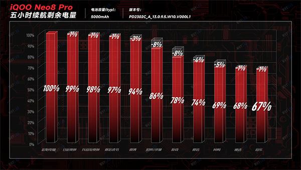 得益于四擋變速以及能效比優(yōu)良的天璣9200+的加持,還是以我們「五小時(shí)續(xù)航測(cè)試」為基準(zhǔn),滿電的iQOO Neo8 Pro跑下來(lái)還剩下67%的電量,這在今天看來(lái)表現(xiàn)也還算不錯(cuò)的,其中「拍照」和「游戲」過(guò)程分別耗去了8%的電量,是10個(gè)項(xiàng)目中最耗電的兩個(gè),這個(gè)成績(jī)?cè)谛阅芷炫炛兴愕蒙媳容^出色的了,基本可以滿足用戶正常使用一天的續(xù)航需求。