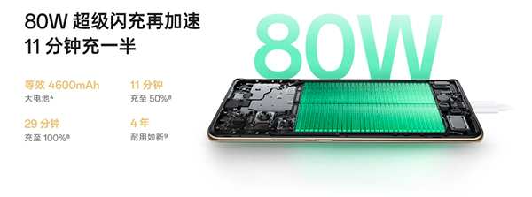 在這個電池方面,OPPO Reno10采用4600mAh大電池,支持80W超級閃充,不過遺憾的是并不支持無線充電,只有這個80W的有線閃充,不過這個80W閃充速度還是不錯的,11分鐘充至50%,29分鐘充至100%。讓你從此告別電量焦慮。