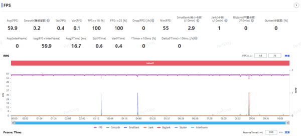 在《王者榮耀》的“高幀率-超高分辨率-極致”畫質(zhì)下,OPPOK11x能夠在10分鐘的游戲中,平均幀率達到了59.9fps,并保持了非常穩(wěn)定的游戲全程幀率。穩(wěn)定性方面,穩(wěn)幀指數(shù)僅為0.2,僅出現(xiàn)了三次小范圍波動,而這些波動通常是由筆者被擊殺而導(dǎo)致的畫面改變所引起的。