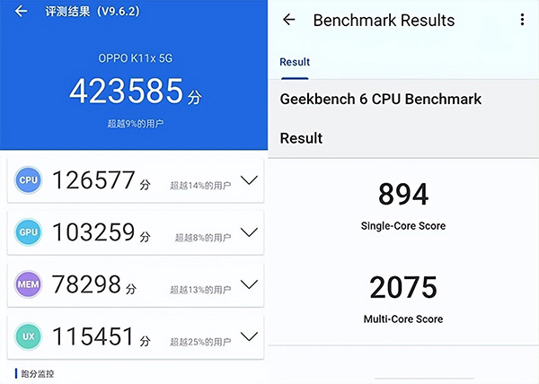 實際性能測試中,OPPO K11x在安兔兔綜合性能的跑分成績輕松超過40萬分大關,在Geekbench 6中多核成績?yōu)?075分,單核成績894分。這樣的成績表明,OPPO K11x足以流暢各類日常任務和重負載游戲。