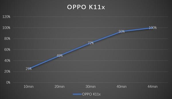 一般除了大家關(guān)注的電池續(xù)航之外,還有就是充電表現(xiàn)了,不同功率的充電帶來的充電速度都是不一樣的,尤其是現(xiàn)在百瓦的充電功率也不是什么稀罕事了,大大的縮短了人們的充電時間,而這次的OPPO K11x在充電方面則是采用的是67W的閃充,這個充電功率并不大,不過也還可以,那這個充電功率怎么樣呢,把電量充慢需要多長時間呢,答案是44分鐘,經(jīng)過實測44分鐘就可以完全回血,充電速度依舊可圈可點。