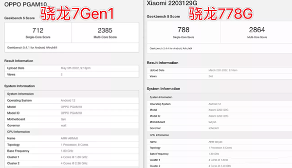 在Geekbench 5測試中,驍龍7Gen1的CPU單核跑分是712,CPU多核跑分是2385。作為對比,驍龍778G的CPU單核跑分是788,CPU多核跑分是2864。
