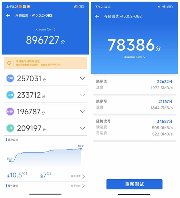 實測搭載天璣8200 Ultra的小米civi3拿下了89萬+的分?jǐn)?shù),相較于上一代產(chǎn)品搭載驍龍7的54萬+分,有著超過30萬分的提升。此外,存儲測試同樣達(dá)到了UFS3.1的天花板水準(zhǔn)。