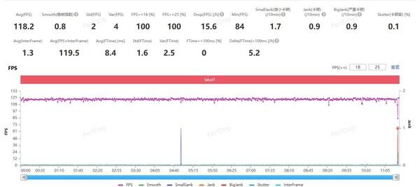 首先是《王者榮耀》,筆者將幀率設置為極高,分辨率為超高,畫面總質(zhì)量為高清(不支持極致畫質(zhì)與極高幀率同時開啟),并且抗鋸齒與水面反射效果都開啟。手機開啟性能模式,外部環(huán)境則是最高31度的戶外溫度且室內(nèi)沒有開空調(diào)。最終在一局黃金段位的排位賽中,該機的平均幀率為118.2FPS,并且在整個游戲過程中,幀率基本保持在一條直線上。