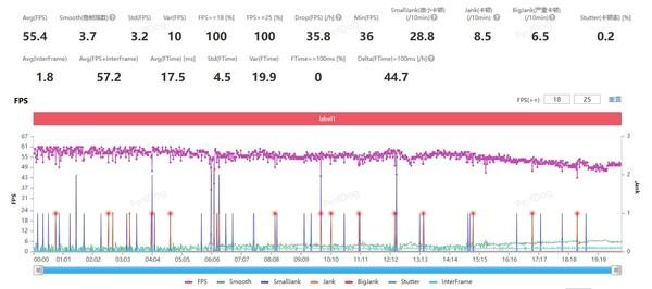 結(jié)束了《王者榮耀》的測試之后,筆者沒有讓Note12T Pro停歇,接著就開始了《原神》的測試,畫質(zhì)開到最高,幀率設置為60。于是在20分鐘的跑圖打怪后,性能狗顯示的平均幀率為55.4FPS。雖然整個過程常有波動,但整體還是穩(wěn)定在一條直線上。這對于一款非旗艦的千元檔機型,表現(xiàn)得已然十分優(yōu)秀。