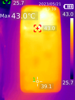 后背芯片區(qū)域最高溫度達(dá)到了43攝氏度,握持區(qū)域在39.1攝氏度,屬于比較溫?zé)崦黠@,但不至于發(fā)燙的程度。
