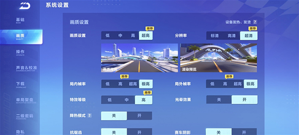 在《QQ飛車手游》的設(shè)置中,將畫面設(shè)置、分辨率、幀率拉滿。