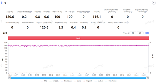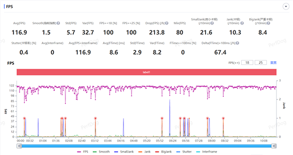 在測(cè)試過程中,前期波動(dòng)明顯,但隨著游戲時(shí)長(zhǎng)的增加,后面表現(xiàn)越來越穩(wěn),最后給出了平均幀率116.9 FPS的結(jié)果。