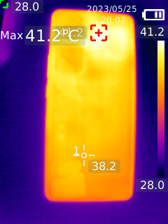 后背芯片區(qū)域的溫度最高只有41.2攝氏度,握持區(qū)域?yàn)?8.2攝氏度。
