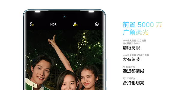 vivo S系列之所以能贏得眾多小姐姐的偏愛,另一方面就是不懼黑夜。當(dāng)然,這就要?dú)w功于vivo S系列獨(dú)有的“秘技”柔光燈了。在vivo S17上,vivo進(jìn)一步優(yōu)化了前置柔光燈的設(shè)計(jì),在屏幕下方新增了導(dǎo)光柱,讓補(bǔ)光燈的指向性更好。此外,vivo還為前置柔光燈適配了前置廣角鏡頭,補(bǔ)光角度也同鏡頭一起增加到了90度,優(yōu)化了補(bǔ)光范圍。