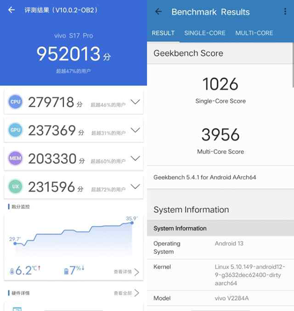 如上圖所示,在安兔兔跑分(V10.0.02)中,vivo S17 Pro獲得超過95.2萬分的好成績;在GeekBench5測試中,vivo S17 Pro單核為1026分,多核為3956分。相比其他同搭載天璣8200的機型,vivo S17 Pro展現(xiàn)出了更強的性能表現(xiàn)。